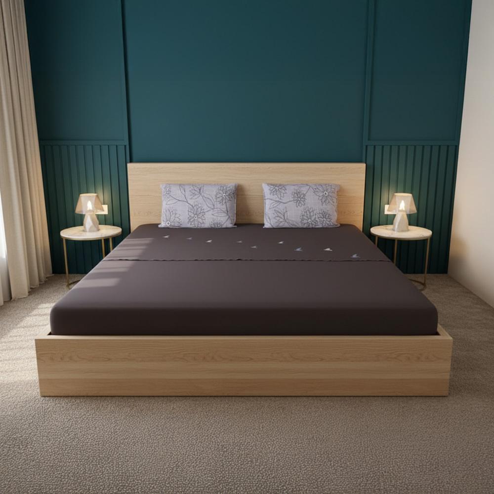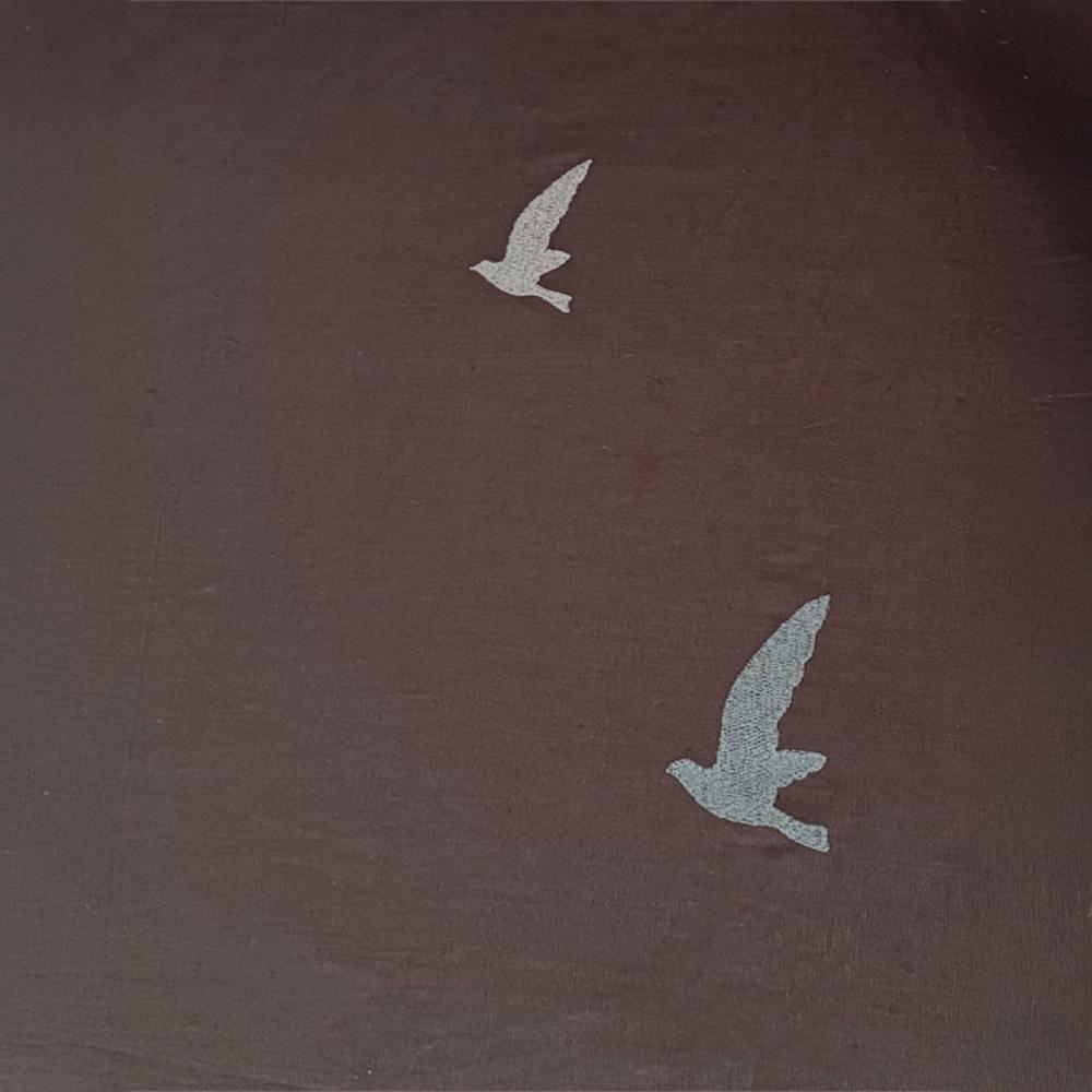 Bird & Floral Embroidery Brown Fitted Bedsheet Set with Pillow Cover