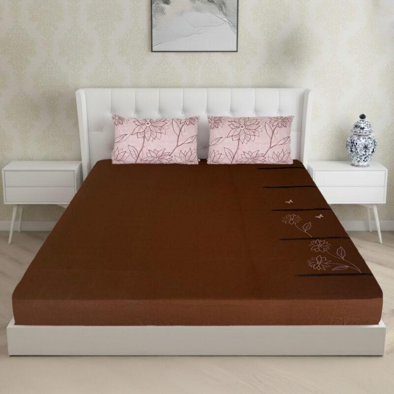 Bird & Floral Embroidery Brown Fitted Bedsheet Set with Pillow Cover